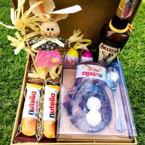 Esta cesta é preenchida com ovos de chocolate artesanais cuidadosamente feitos à mão com delicioso recheio de Nutella e acompanhados por uma garrafa da sua bebida preferida.